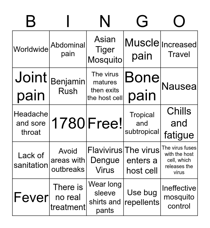 This bingo card has a free space and 29 words: Fever, 1885, 1780, Philadelphia, Worldwide, Asian Tiger Mosquito, Benjamin Rush, Avoid areas with outbreaks, Tropical and subtropical, There is no real treatment, Chills and fatigue, Ineffective mosquito control, Wear long sleeve shirts and pants, Use bug repellents, Nausea, Vomiting, Flavivirus Dengue Virus, Lack of sanitation, Increased Travel, Headache and sore throat, The virus enters a host cell, Be aware of peak exposure times and places, Bone pain, Joint pain, Muscle pain, Abdominal pain, The virus fuses with the host cell, which releases the virus, The virus matures then exits the host cell and It separates & creates more virus cells.