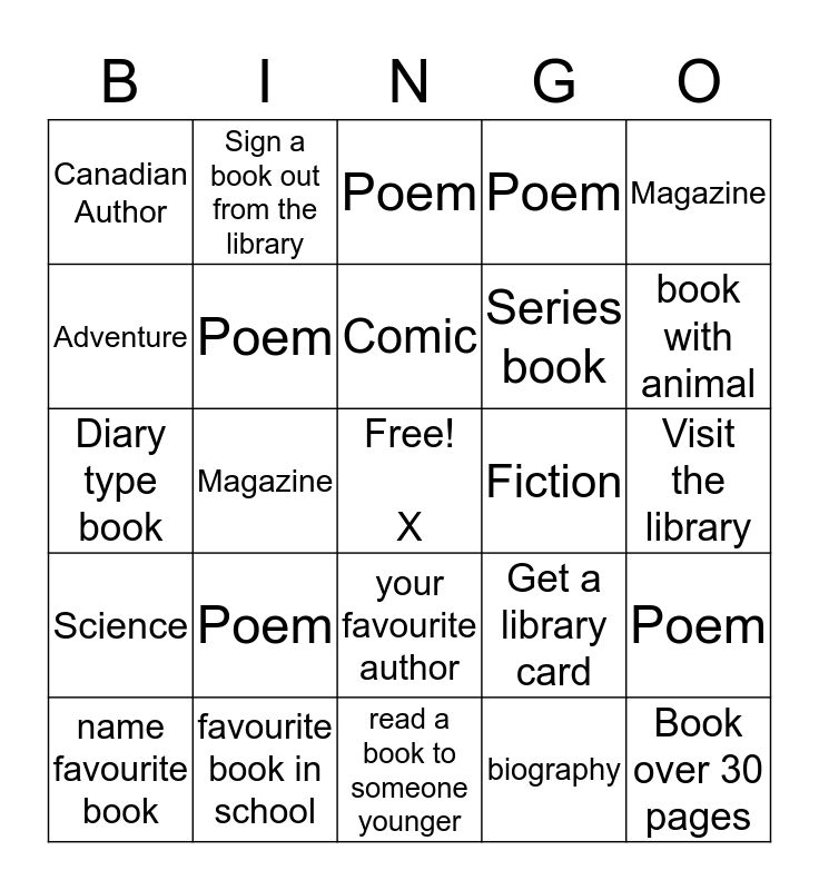 This bingo card has a free space and 24 words: Poem, favourite book in school, Comic, name favourite book, Magazine, Canadian Author, Adventure, Sign a book out from the library, Fiction, your favourite author, Series book, Diary type book, Get a library card, Poem, Poem, biography, Visit the library, Poem, book with animal, Magazine, Book over 30 pages, Science, Poem and read a book to someone younger.