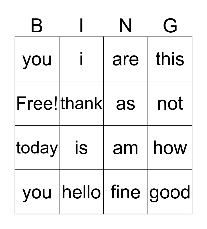 This bingo card has 16 words: hello, how, are, you, today, i, am, fine, Free!, thank, you, this, is, not, as and good.