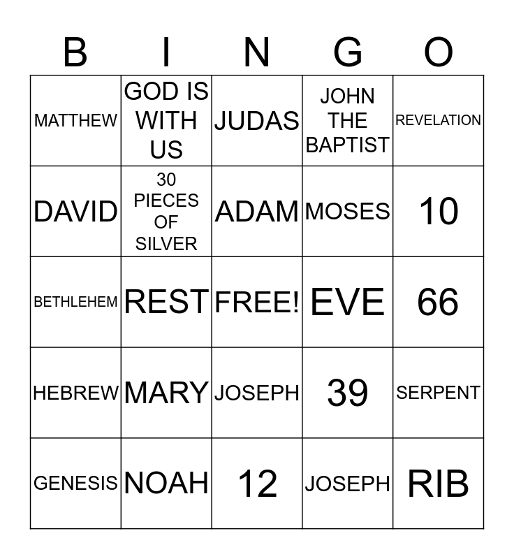This bingo card has a free space and 24 words: MARY, NOAH, ADAM, GENESIS, REVELATION, MATTHEW, DAVID, GOD IS WITH US, EVE, JOSEPH, MOSES, BETHLEHEM, 39, SERPENT, 30 PIECES OF SILVER, JOSEPH, 66, JUDAS, 10, REST, RIB, HEBREW, JOHN THE BAPTIST and 12.