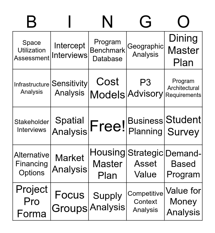 This bingo card has a free space and 24 words: Market Analysis, Focus Groups, Cost Models, Project Pro Forma, Dining Master Plan, Space Utilization Assessment, Infrastructure Analysis, Intercept Interviews, Business Planning, Housing Master Plan, P3 Advisory, Stakeholder Interviews, Strategic Asset Value, Demand-Based Program, Sensitivity Analysis, Competitive Context Analysis, Student Survey, Program Benchmark Database, Program Architectural Requirements, Spatial Analysis, Value for Money Analysis, Alternative Financing Options, Geographic Analysis and Supply Analysis.