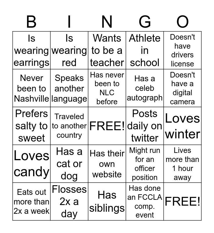 This bingo card has a free space and 24 words: Has a cat or dog, Flosses 2x a day, Has never been to NLC before, Eats out more than 2x a week, Doesn't have drivers license, Is wearing earrings, Never been to Nashville, Is wearing red, Posts daily on twitter, Has their own website, Has a celeb autograph, Prefers salty to sweet, Might run for an officer position, Lives more than 1 hour away, Speaks another language, Has done an FCCLA comp. event, Loves winter, Wants to be a teacher, Doesn't have a digital camera, Traveled to another country, FREE!, Loves candy, Athlete in school and Has siblings.