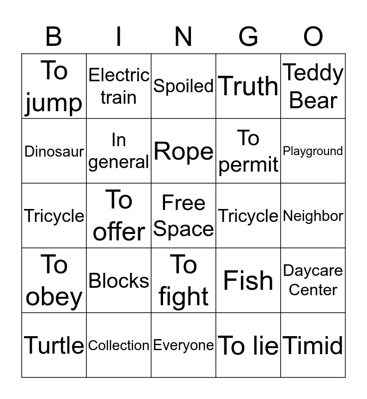 This bingo card has a free space and 24 words: Blocks, Collection, Rope, Turtle, Teddy Bear, To jump, Dinosaur, Electric train, Tricycle, To fight, To permit, Tricycle, Fish, Daycare Center, In general, To lie, Neighbor, Spoiled, Playground, To offer, Timid, To obey, Truth and Everyone.