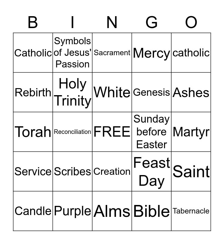 This bingo card has a free space and 24 words: Scribes, Purple, White, Candle, catholic, Catholic, Rebirth, Symbols of Jesus' Passion, Sunday before Easter, Creation, Genesis, Torah, Feast Day, Saint, Holy Trinity, Bible, Martyr, Sacrament, Ashes, Reconciliation, Tabernacle, Service, Mercy and Alms.