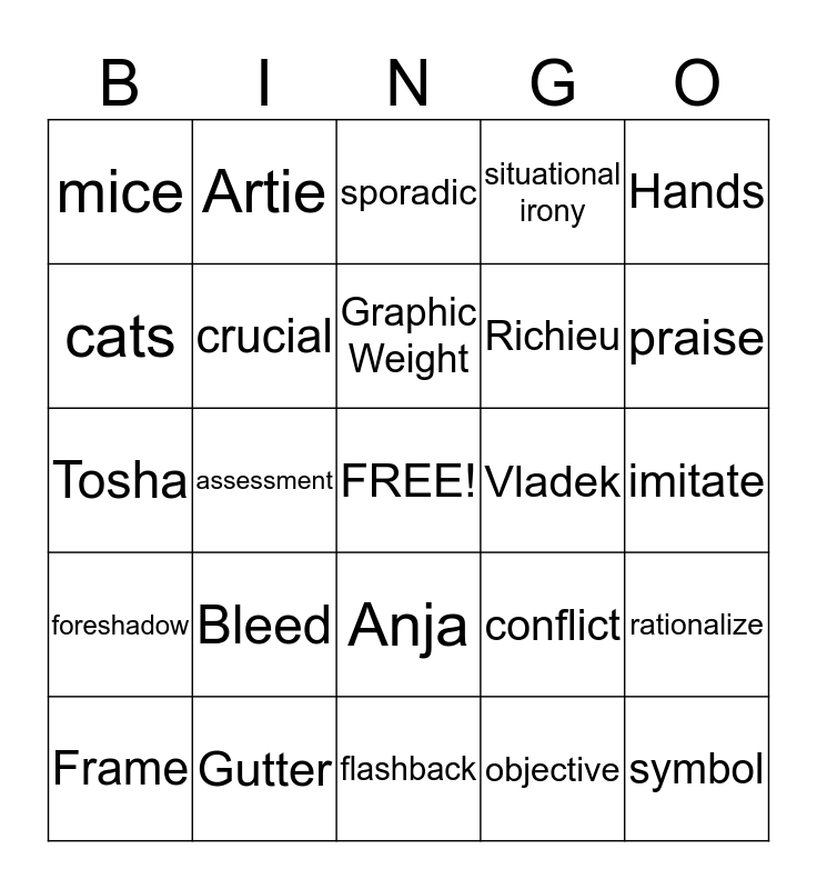 This bingo card has a free space and 24 words: Bleed, Gutter, Graphic Weight, Frame, Hands, mice, cats, Artie, Vladek, Anja, Richieu, Tosha, conflict, rationalize, crucial, objective, imitate, sporadic, praise, assessment, symbol, foreshadow, situational irony and flashback.