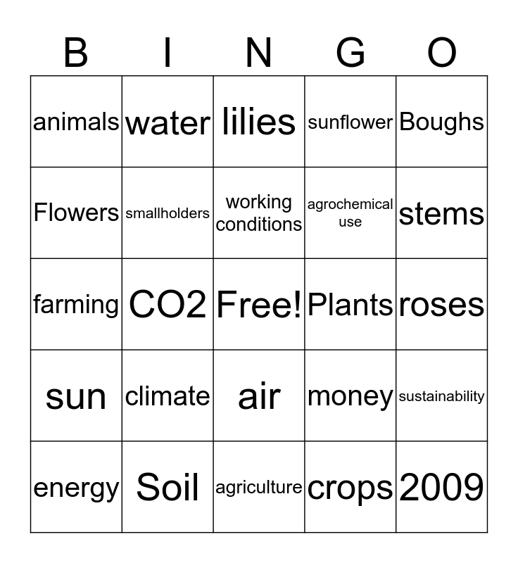 This bingo card has a free space and 24 words: climate, Soil, working conditions, energy, Boughs, animals, Flowers, water, Plants, air, agrochemical use, farming, money, sustainability, smallholders, crops, roses, lilies, stems, CO2, 2009, sun, sunflower and agriculture.