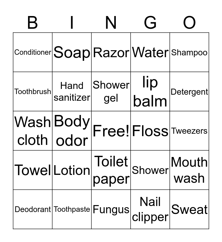This bingo card has a free space and 24 words: Lotion, Toothpaste, Shower gel, Deodorant, Shampoo, Conditioner, Toothbrush, Soap, Floss, Toilet paper, lip balm, Wash cloth, Shower, Mouth wash, Hand sanitizer, Nail clipper, Tweezers, Razor, Detergent, Body odor, Sweat, Towel, Water and Fungus.