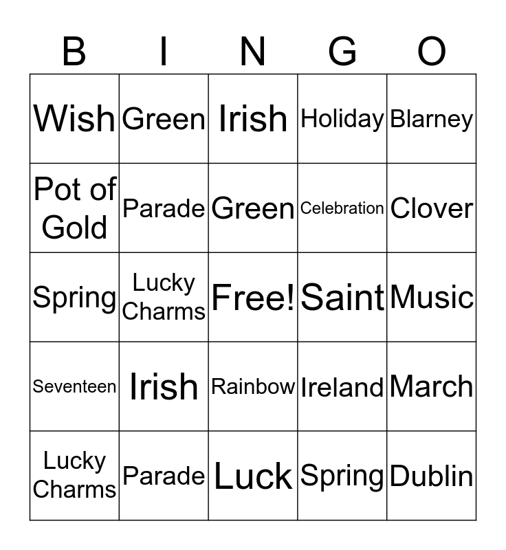 This bingo card has a free space and 50 words: Celtic, Dublin, Clover, Luck, Irish, Rainbow, Green, Shamrock, Pot of Gold, leprechaun, Parade, Holiday, March, Ireland, Tradition, Music, Green, Saint, Patrick, Blarney, Lucky Charms, Spring, Wish, Celebration, Celtic, Dublin, Clover, Luck, Irish, Rainbow, Green, Shamrock, Pot of Gold, Leprechaun, Parade, Holiday, March, Ireland, Tradition, Music, Green, Saint, Patrick, Blarney, Lucky Charms, Spring, Wish, Celebration, Seventeen and Magic.