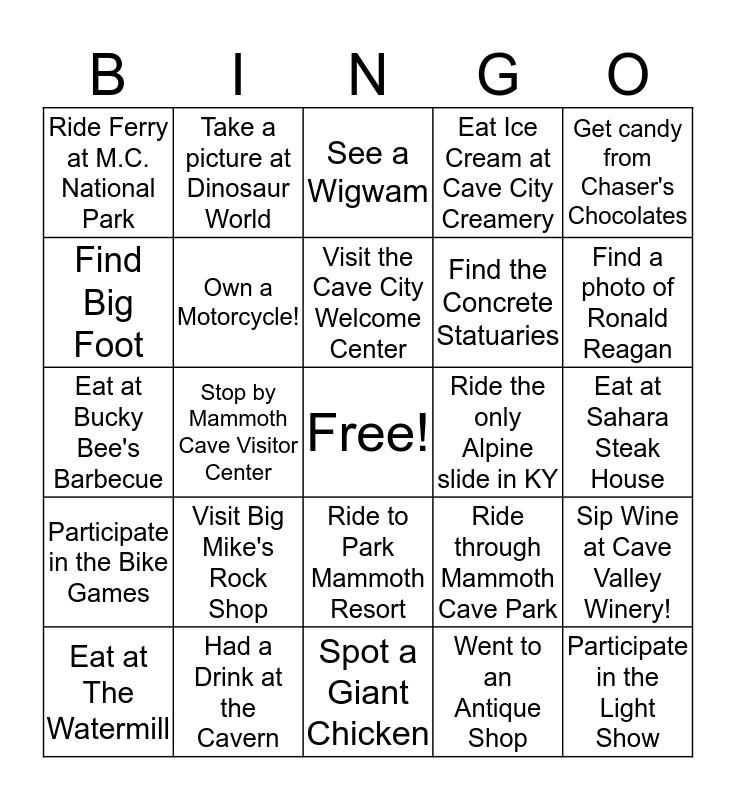 This bingo card has a free space and 24 words: Visit Big Mike's Rock Shop, Had a Drink at the Cavern, Visit the Cave City Welcome Center, Eat at The Watermill, Get candy from Chaser's Chocolates, Ride Ferry at M.C. National Park, Find Big Foot, Take a picture at Dinosaur World, Ride the only Alpine slide in KY, Ride to Park Mammoth Resort, Find the Concrete Statuaries, Eat at Bucky Bee's Barbecue, Ride through Mammoth Cave Park, Sip Wine at Cave Valley Winery!, Own a Motorcycle!, Went to an Antique Shop, Eat at Sahara Steak House, See a Wigwam, Find a photo of Ronald Reagan, Stop by Mammoth Cave Visitor Center, Participate in the Light Show, Participate in the Bike Games, Eat Ice Cream at Cave City Creamery and Spot a Giant Chicken.