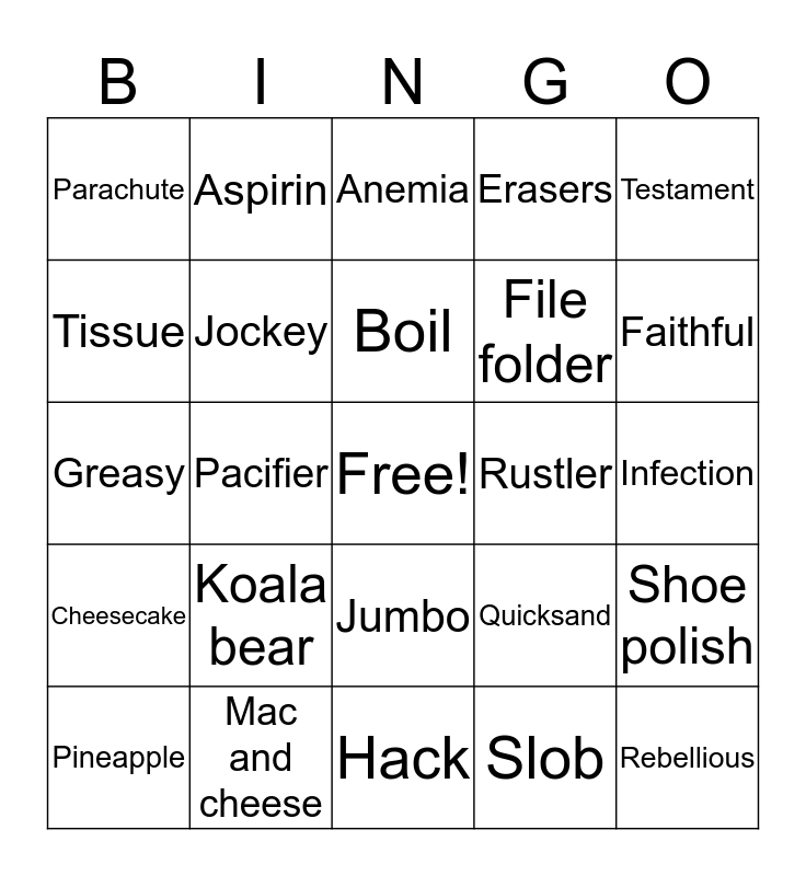 This bingo card has a free space and 30 words: Mac and cheese, Acupuncture, Pacifier, Backbone, Parachute, Anemia, Jockey, Jumbo, Rustler, Hack, Infection, Rebellious, Slob, Captivity, Faithful, Flabby, Quicksand, Cheesecake, Koala bear, Testament, Greasy, Nail Clippers, Aspirin, File folder, Tissue, Erasers, Shoe polish, Pineapple, Boil and Metal.