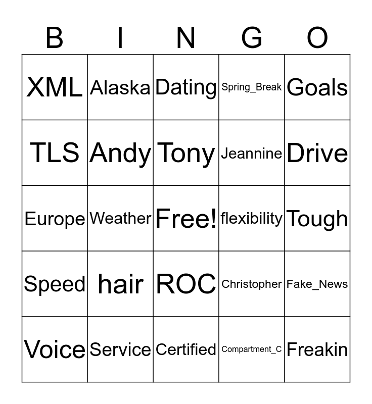 This bingo card has a free space and 26 words: ROC, Compartment_C, Tony, Service, Goals, XML, TLS, Alaska, Tough, Christopher, Jeannine, Europe, Fake_News, Voice, Weather, Mexican, Spring_Break, Speed, Dating, Freakin, Drive, Certified, flexibility, hair, Andy and happy_hour.