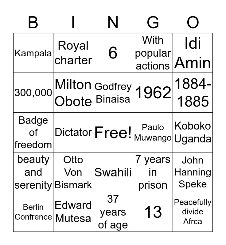 This bingo card has a free space and 24 words: Otto Von Bismark, Edward Mutesa, Godfrey Binaisa, Berlin Confrence, Idi Amin, Kampala, 300,000, Royal charter, Paulo Muwango, Swahili, 1962, Badge of freedom, 7 years in prison, John Hanning Speke, Milton Obote, 13, Koboko Uganda, 6, 1884-1885, Dictator, Peacefully divide Afrca, beauty and serenity, With popular actions and 37 years of age.