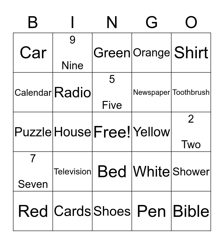 This bingo card has a free space and 24 words: Television, Cards, 5 Five, Red, Shirt, Car, Calendar, 9 Nine, Yellow, Bed, Newspaper, Puzzle, White, Shower, Radio, Pen, 2 Two, Green, Toothbrush, House, Bible, 7 Seven, Orange and Shoes.