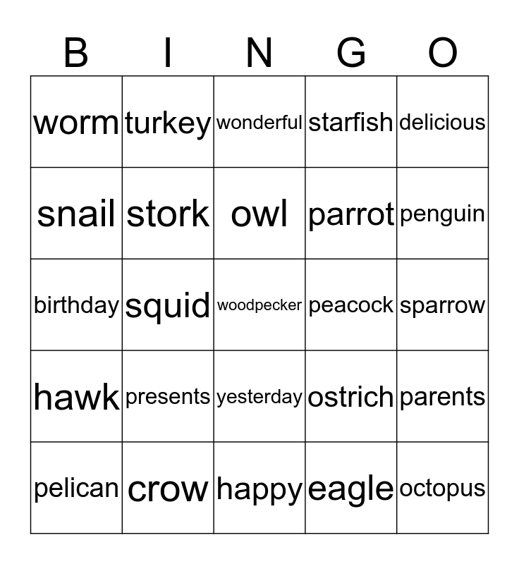 This bingo card has 33 words: octopus, pigeon, squid, flamingo, hawk, stork, delicious, pelican, turkey, games, owl, wonderful, swan, table, peacock, penguin, crow, birthday, presents, ostrich, yesterday, sea gull, worm, sparrow, happy, woodpecker, starfish, parrot, snail, parents, cake, eagle and jellyfish.