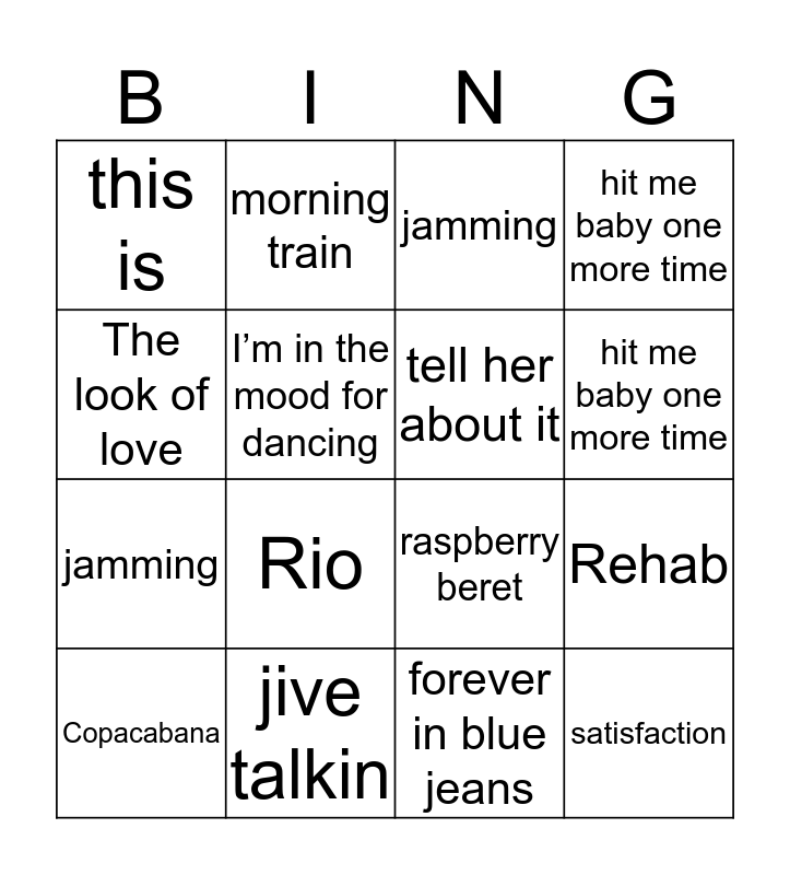 ⚠ This card has duplicate items: The look of love (2), Rehab (2), this is (2), Copacabana (2), jive talkin (2), tell her about it (2), one way or another (2), jamming (2), living on a prayer (2), hit me baby one more time (2), do you really want to hurt me (2), I could be so good for you (2), Rio (2), everyone’s a winner (2), the power of love (2)