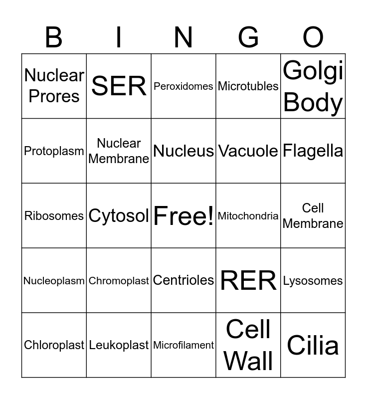 This bingo card has a free space and 24 words: Chromoplast, Leukoplast, Nucleus, Chloroplast, Golgi Body, Nuclear Prores, Protoplasm, SER, Mitochondria, Centrioles, Vacuole, Ribosomes, RER, Lysosomes, Nuclear Membrane, Cell Wall, Cell Membrane, Peroxidomes, Flagella, Cytosol, Cilia, Nucleoplasm, Microtubles and Microfilament.