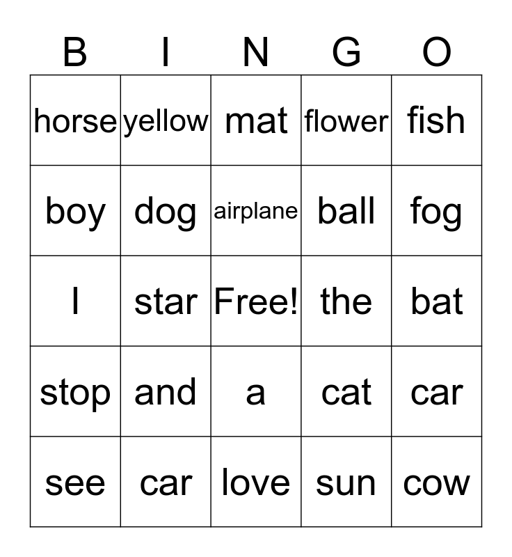 This bingo card has a free space and 24 words: and, car, airplane, see, fish, horse, boy, yellow, the, a, ball, I, cat, car, dog, sun, bat, mat, fog, star, cow, stop, flower and love.