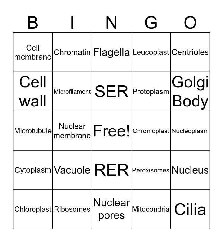 This bingo card has a free space and 24 words: Vacuole, Ribosomes, SER, Chloroplast, Centrioles, Cell membrane, Cell wall, Chromatin, Chromoplast, RER, Protoplasm, Microtubule, Peroxisomes, Nucleus, Microfilament, Mitocondria, Nucleoplasm, Flagella, Golgi Body, Nuclear membrane, Cilia, Cytoplasm, Leucoplast and Nuclear pores.