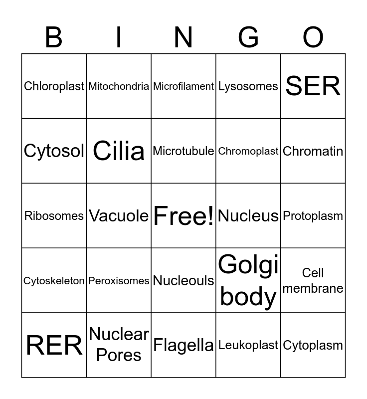 This bingo card has a free space and 24 words: Peroxisomes, Nuclear Pores, Microtubule, RER, SER, Chloroplast, Cytosol, Mitochondria, Nucleus, Nucleouls, Chromoplast, Ribosomes, Golgi body, Cell membrane, Cilia, Leukoplast, Protoplasm, Microfilament, Chromatin, Vacuole, Cytoplasm, Cytoskeleton, Lysosomes and Flagella.
