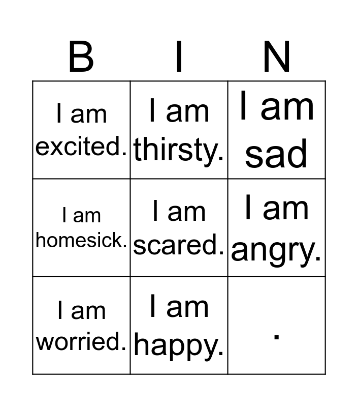 This bingo card has 10 words: I am happy., I am sad, I am excited., I am scared., I am homesick., I am worried., I am thirsty., I am hungry., I am angry. and ..