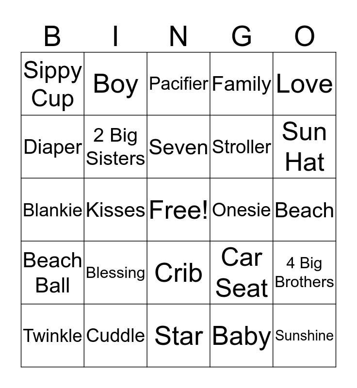 This bingo card has a free space and 37 words: Lowe, Dona, Evan, 2 Big Sisters, 4 Big Brothers, Blessing, Seven, Surprise, Love, Hugs, Kisses, Family, Sunshine, Beach, Diaper, Beach Ball, Bucket, Pacifier, Crib, Onesie, Sippy Cup, Sun Hat, Twinkle, Star, Seashell, Baby, Boy, Cute, Adorable, Sweet, Snuggle, Cuddle, Blankie, Rattle, Car Seat, Stroller and Pack and Play.