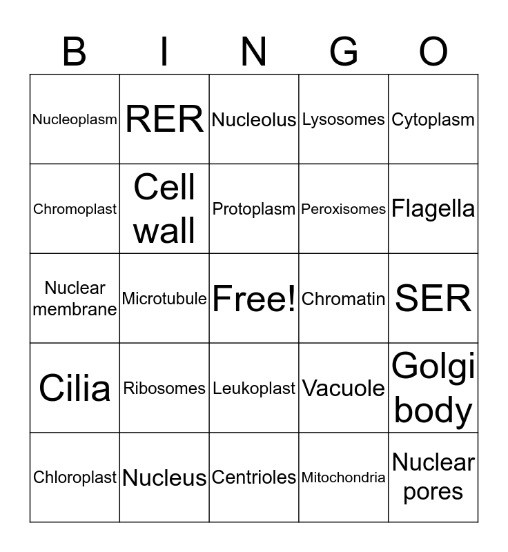 This bingo card has a free space and 24 words: Ribosomes, Nucleus, Protoplasm, Chloroplast, Cytoplasm, Nucleoplasm, Chromoplast, RER, Chromatin, Leukoplast, Peroxisomes, Nuclear membrane, Vacuole, Golgi body, Cell wall, Mitochondria, SER, Nucleolus, Flagella, Microtubule, Nuclear pores, Cilia, Lysosomes and Centrioles.