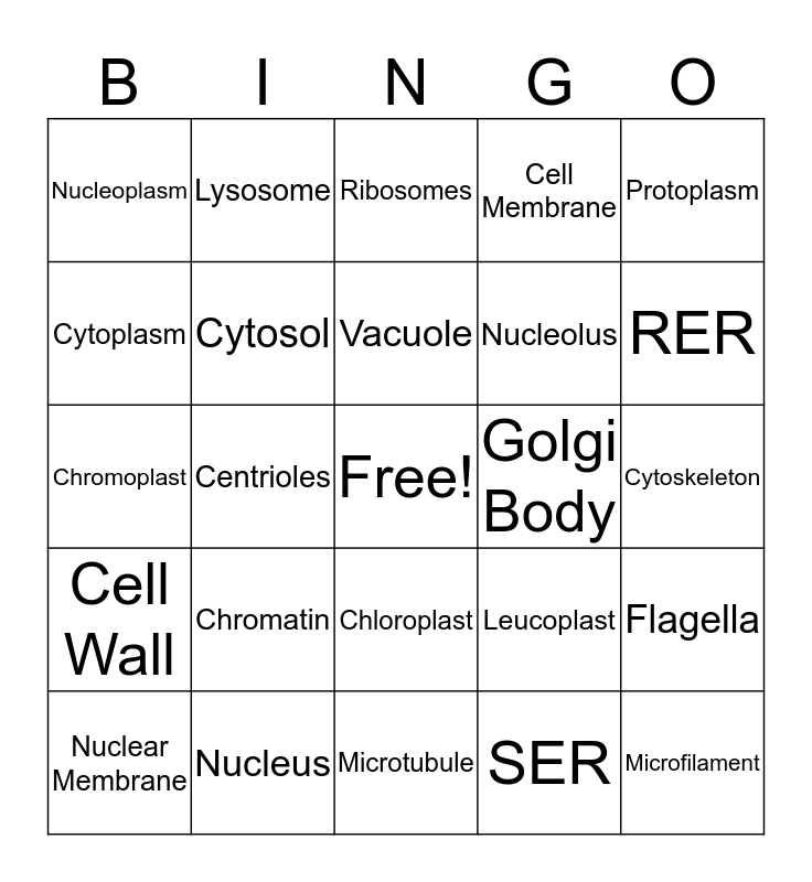 This bingo card has a free space and 24 words: Chromatin, Nucleus, Vacuole, Nuclear Membrane, Protoplasm, Nucleoplasm, Cytoplasm, Lysosome, Golgi Body, Chloroplast, Nucleolus, Chromoplast, Leucoplast, Flagella, Cytosol, SER, Cytoskeleton, Ribosomes, RER, Centrioles, Microfilament, Cell Wall, Cell Membrane and Microtubule.