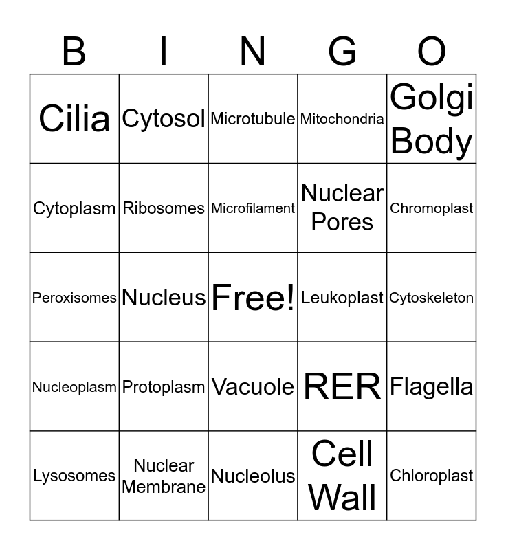 This bingo card has a free space and 24 words: Protoplasm, Nuclear Membrane, Microfilament, Lysosomes, Golgi Body, Cilia, Cytoplasm, Cytosol, Leukoplast, Vacuole, Nuclear Pores, Peroxisomes, RER, Flagella, Ribosomes, Cell Wall, Cytoskeleton, Microtubule, Chromoplast, Nucleus, Chloroplast, Nucleoplasm, Mitochondria and Nucleolus.