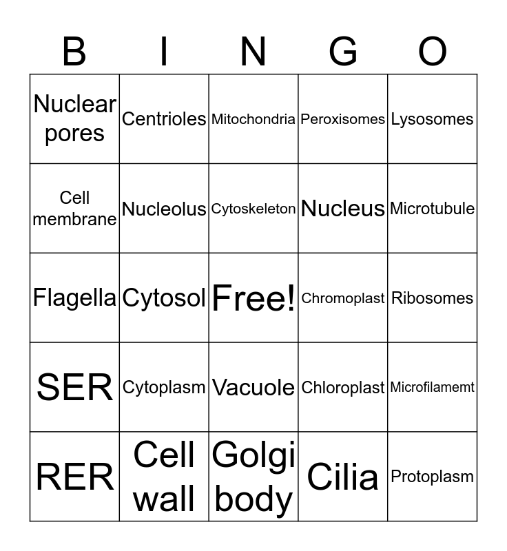 This bingo card has a free space and 24 words: Cytoplasm, Cell wall, Cytoskeleton, RER, Lysosomes, Nuclear pores, Cell membrane, Centrioles, Chromoplast, Vacuole, Nucleus, Flagella, Chloroplast, Microfilamemt, Nucleolus, Cilia, Ribosomes, Mitochondria, Microtubule, Cytosol, Protoplasm, SER, Peroxisomes and Golgi body.