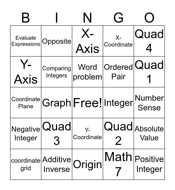 This bingo card has a free space and 24 words: Quad 3, Additive Inverse, Word problem, coordinate grid, Quad 4, Evaluate Expressions, Y- Axis, Opposite, Integer, Y- Coordinate, Ordered Pair, Coordinate Plane, Quad 2, Absolute Value, Comparing Integers, Math 7, Number Sense, X- Axis, Quad 1, Graph, Positive Integer, Negative Integer, X- Coordinate and Origin.