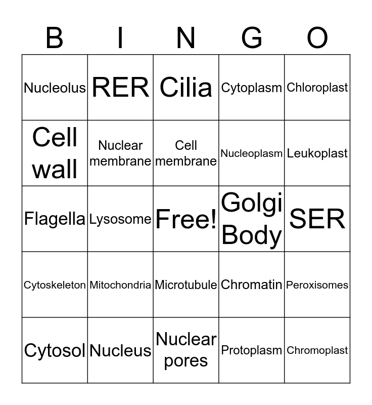 This bingo card has a free space and 24 words: Mitochondria, Nucleus, Cell membrane, Cytosol, Chloroplast, Nucleolus, Cell wall, RER, Golgi Body, Microtubule, Nucleoplasm, Flagella, Chromatin, Peroxisomes, Nuclear membrane, Protoplasm, SER, Cilia, Leukoplast, Lysosome, Chromoplast, Cytoskeleton, Cytoplasm and Nuclear pores.