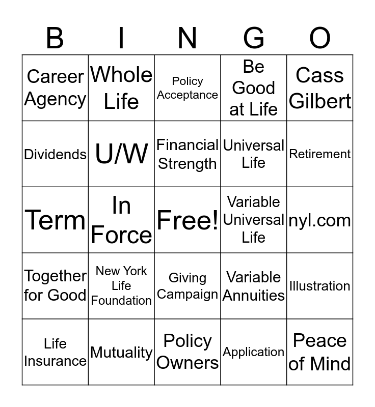This bingo card has a free space and 24 words: New York Life Foundation, Mutuality, Financial Strength, Life Insurance, Cass Gilbert, Career Agency, Dividends, Whole Life, Variable Universal Life, Giving Campaign, Universal Life, Term, Variable Annuities, Illustration, U/W, Application, nyl.com, Policy Acceptance, Retirement, In Force, Peace of Mind, Together for Good, Be Good at Life and Policy Owners.