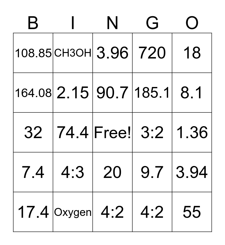 This bingo card has a free space and 24 words: 4:3, Oxygen, 90.7, 17.4, 18, 108.85, 164.08, CH3OH, 3:2, 20, 185.1, 32, 9.7, 3.94, 2.15, 4:2, 1.36, 3.96, 8.1, 74.4, 55, 7.4, 720 and 4:2.