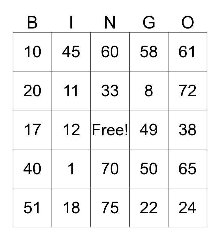 This bingo card has a free space and 24 words: 1, 18, 33, 51, 61, 10, 20, 45, 49, 70, 8, 17, 50, 65, 11, 22, 38, 60, 72, 12, 24, 40, 58 and 75.