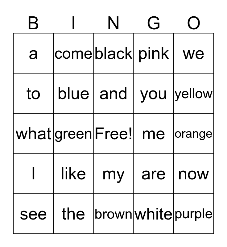 This bingo card has a free space and 24 words: like, the, and, see, we, a, to, come, me, my, you, what, are, now, blue, white, orange, black, yellow, green, purple, I, pink and brown.