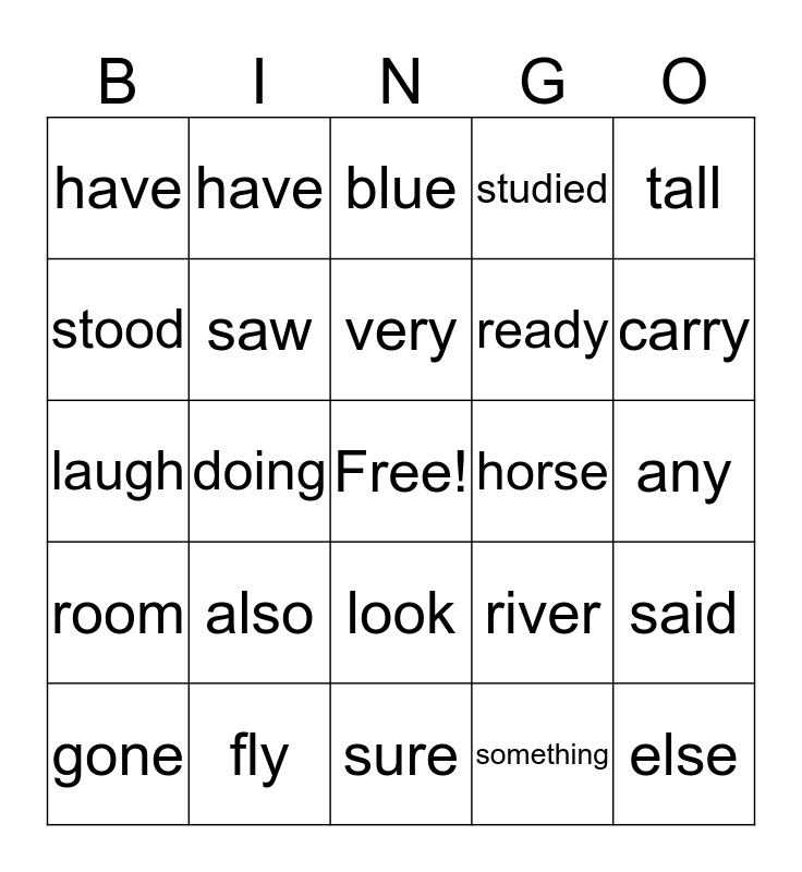 This bingo card has a free space and 24 words: also, fly, very, gone, tall, have, stood, have, horse, look, ready, laugh, river, said, saw, something, any, blue, carry, doing, else, room, studied and sure.