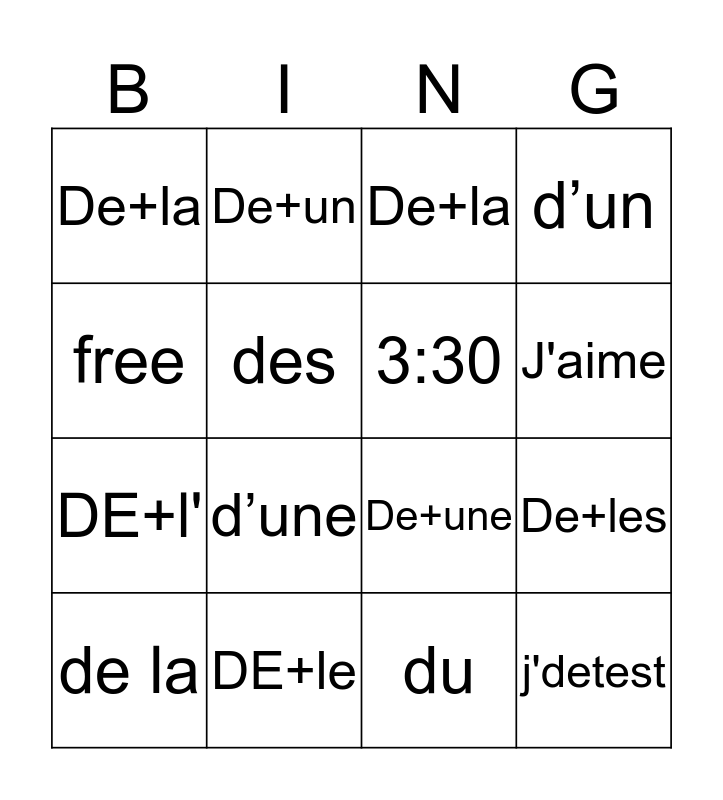 This bingo card has 16 words: DE+le, De+les, De+la, De+la, DE+l', De+un, De+une, du, free, des, de la, d’un, d’une, J'aime, 3:30 and j'detest.