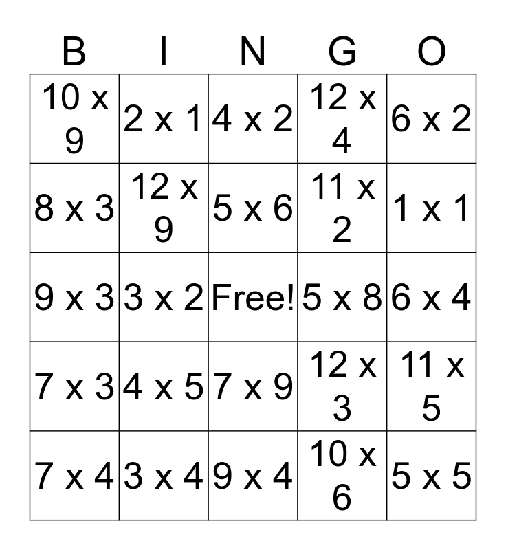 This bingo card has a free space and 24 words: 4 x 5, 3 x 4, 5 x 6, 7 x 4, 6 x 2, 10 x 9, 8 x 3, 2 x 1, 5 x 8, 7 x 9, 11 x 2, 9 x 3, 12 x 3, 11 x 5, 12 x 9, 10 x 6, 6 x 4, 4 x 2, 1 x 1, 3 x 2, 5 x 5, 7 x 3, 12 x 4 and 9 x 4.