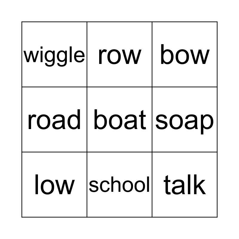 This bingo card has 9 words: low, bow, row, road, wiggle, soap, boat, talk and school.