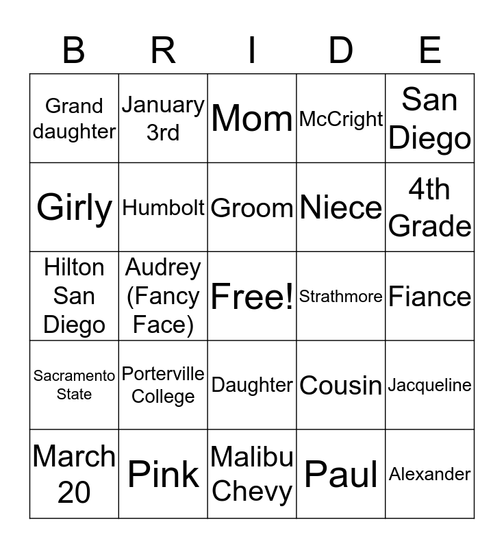 This bingo card has a free space and 34 words: Katrina, Paul, Teacher, Santa Fe, Sacramento State, Humbolt, San Diego, March 20, January 3rd, Bride, Groom, Mom, Dad, Kaylee, Strathmore, 4th Grade, Pink, Hilton San Diego, Porterville College, Cousin, Daughter, Sister, Grand daughter, Fiance, Malibu Chevy, Alexander, McCright, Greenwood, Niece, Girly, Jaime, Audrey (Fancy Face), Jacqueline and Megan.