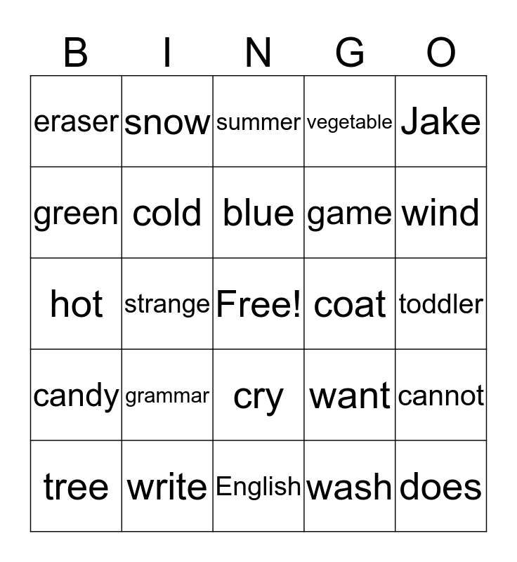 This bingo card has a free space and 74 words: seasons, winter, summer, spring, fall, easy, not easy, hard, tree, hamburger, orange, apple, blue, green, color, strange, leaves, wind, sun, hot, cold, snow, vegetable, do, does, how, what, why, who, Rose, Jake, nose, hand, face, brush, wash, no, yes, sentence, capital letter, English, write, draw, pen, pencil, eraser, unit, grammar, change, grow, child, baby, toddler, adult, walk, talk, cry, eat, can, cannot, game, bingo, candy, prize, coat, we, is, are, want, he, she, have, a and all.