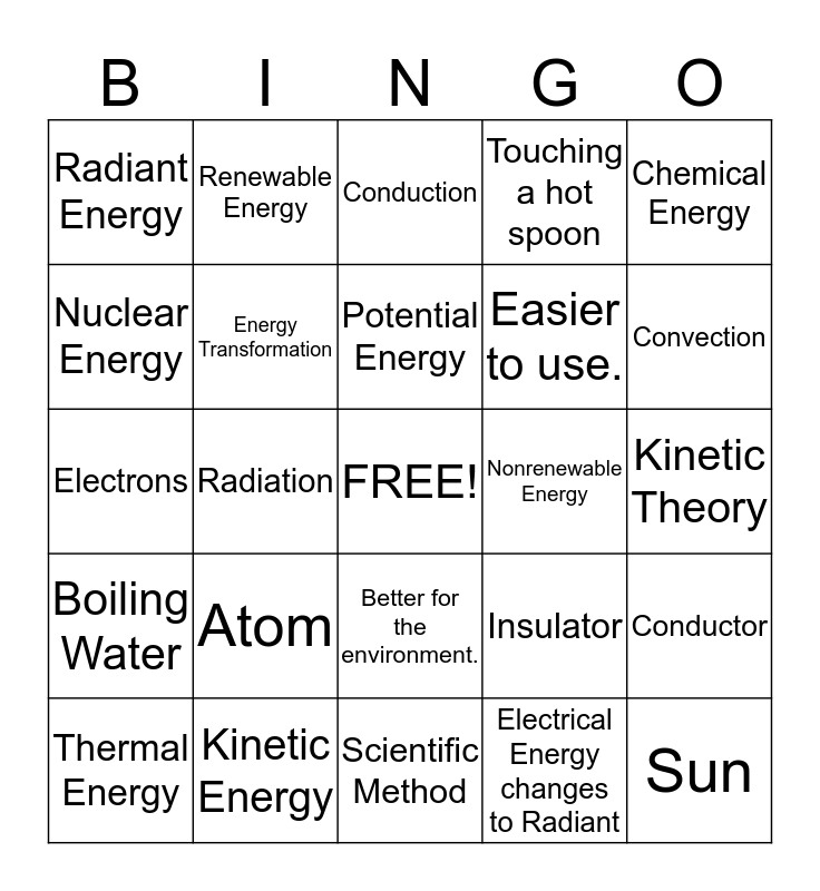 This bingo card has a free space and 24 words: Atom, Kinetic Energy, Potential Energy, Thermal Energy, Chemical Energy, Radiant Energy, Nuclear Energy, Renewable Energy, Nonrenewable Energy, Better for the environment., Easier to use., Electrons, Insulator, Conductor, Energy Transformation, Electrical Energy changes to Radiant, Kinetic Theory, Conduction, Convection, Radiation, Sun, Boiling Water, Touching a hot spoon and Scientific Method.