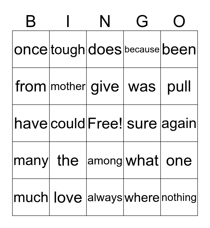 This bingo card has a free space and 24 words: the, love, give, much, been, once, from, tough, sure, among, was, have, what, one, mother, where, again, does, pull, could, nothing, many, because and always.