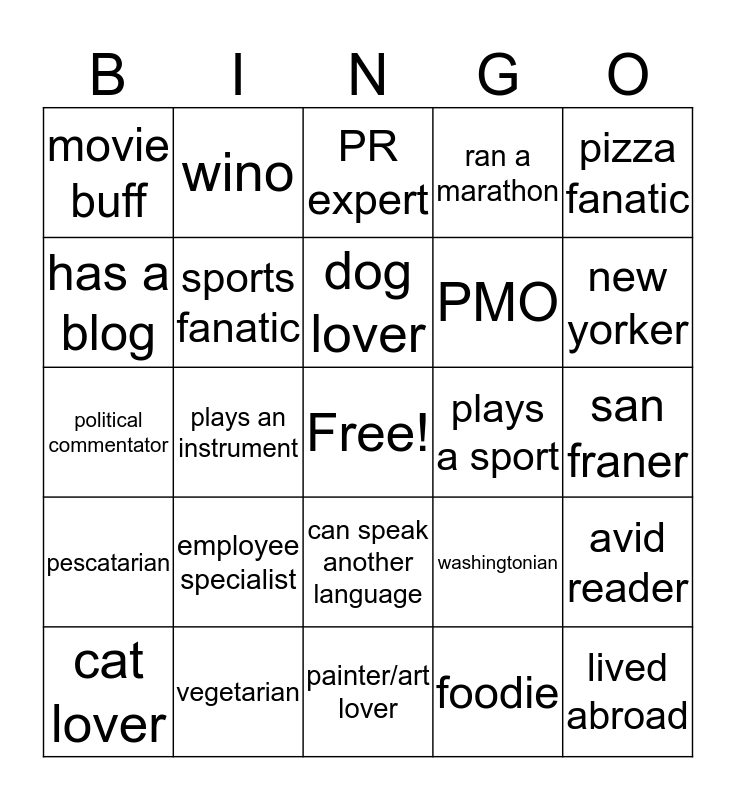 This bingo card has a free space and 24 words: employee specialist, vegetarian, dog lover, cat lover, pizza fanatic, movie buff, has a blog, wino, plays a sport, can speak another language, PMO, political commentator, washingtonian, avid reader, sports fanatic, foodie, san franer, PR expert, new yorker, plays an instrument, lived abroad, pescatarian, ran a marathon and painter/art lover.