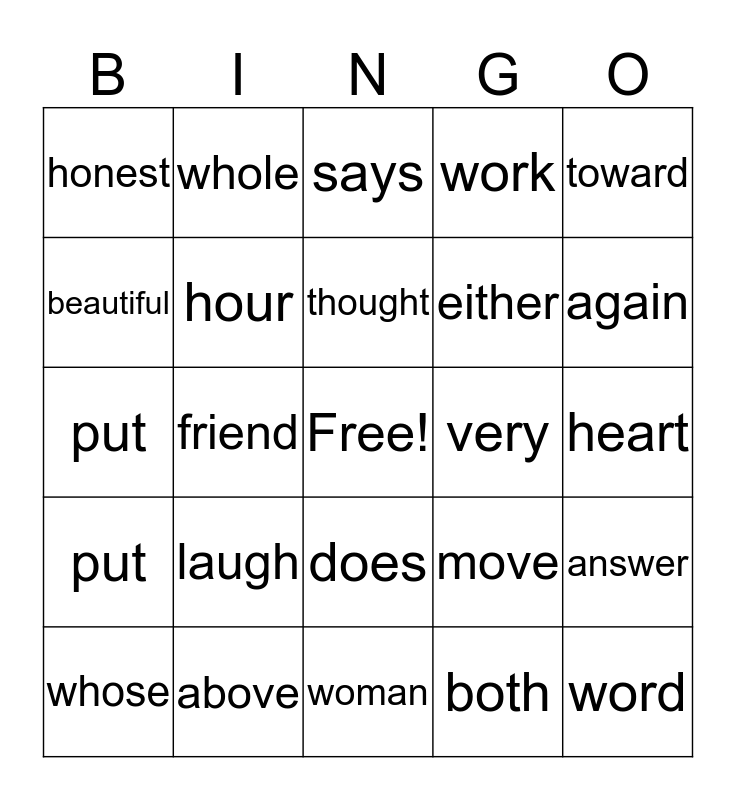 This bingo card has a free space and 24 words: laugh, above, thought, whose, toward, honest, beautiful, whole, very, does, either, put, move, answer, hour, both, heart, says, again, friend, word, put, work and woman.