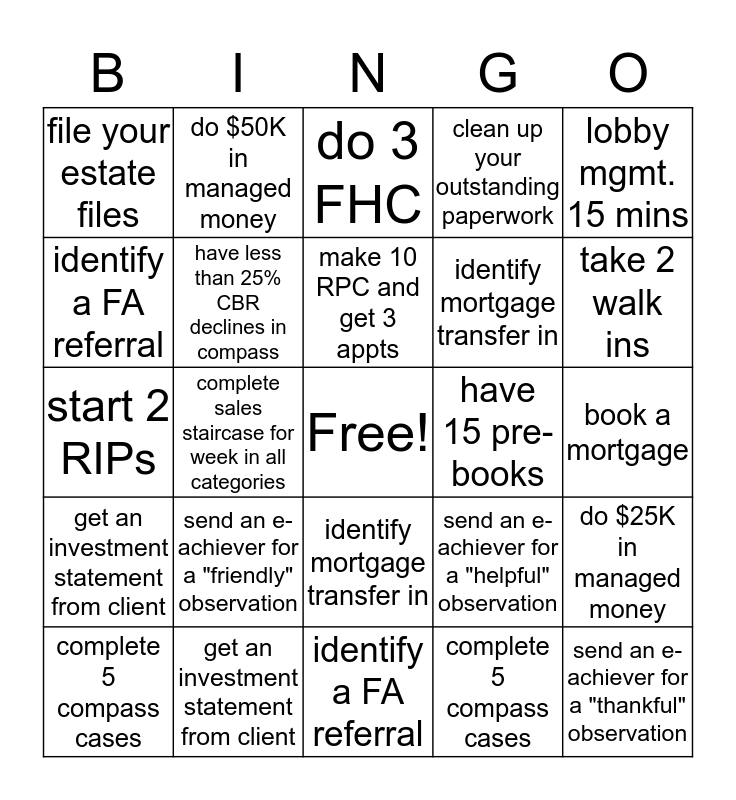 This bingo card has a free space and 24 words: send an e-achiever for a "friendly" observation, get an investment statement from client, make 10 RPC and get 3 appts, complete 5 compass cases, lobby mgmt. 15 mins, file your estate files, identify a FA referral, do $50K in managed money, have 15 pre-books, identify mortgage transfer in, identify mortgage transfer in, start 2 RIPs, send an e-achiever for a "helpful" observation, do $25K in managed money, have less than 25% CBR declines in compass, complete 5 compass cases, book a mortgage, do 3 FHC, take 2 walk ins, complete sales staircase for week in all categories, send an e-achiever for a "thankful" observation, get an investment statement from client, clean up your outstanding paperwork and identify a FA referral.