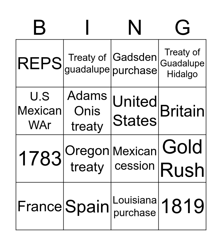 This bingo card has 16 words: Spain, Gold Rush, Gadsden purchase, REPS, 1783, Treaty of guadalupe, Mexican cession, Louisiana purchase, U.S Mexican WAr, Adams Onis treaty, France, Treaty of Guadalupe Hidalgo, Oregon treaty, Britain, United States and 1819.