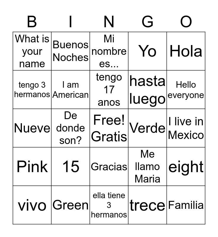This bingo card has a free space and 24 words: 15, Green, tengo 17 anos, vivo, Hola, What is your name, tengo 3 hermanos, Buenos Noches, Verde, Gracias, hasta luego, Nueve, Me llamo Maria, eight, I am American, trece, I live in Mexico, Mi nombre es..., Hello everyone, De donde son?, Familia, Pink, Yo and ella tiene 3 hermanos.