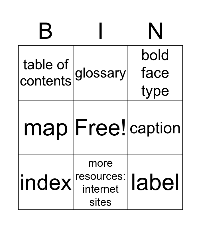 This bingo card has a free space and 8 words: caption, bold face type, glossary, index, table of contents, label, map and more resources: internet sites.