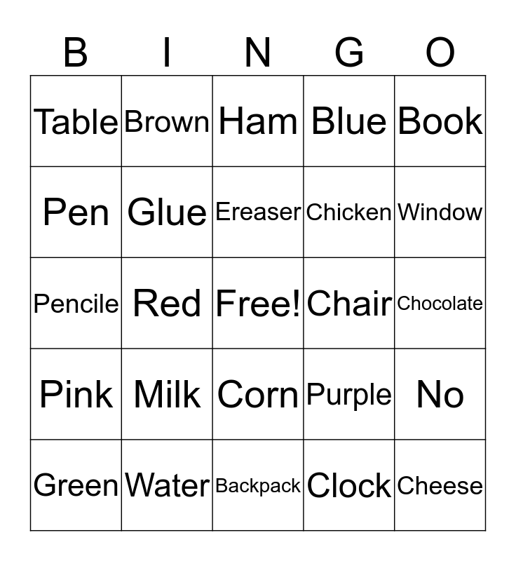 This bingo card has a free space and 24 words: Milk, Water, Ereaser, Green, Book, Table, Pen, Brown, Chair, Corn, Chicken, Pencile, Purple, No, Glue, Clock, Chocolate, Ham, Window, Red, Cheese, Pink, Blue and Backpack.
